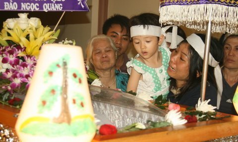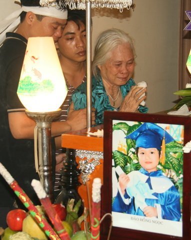 Bên hông quan tài bé Hồng Ngọc, một bà cụ tóc bạc như cước dàn dụa nước mắt. Cụ là bà nội của cháu. Mắt cụ đăm đăm nhìn qua lớp kính…Ở bên cạnh, nhiều anh chị em của anh Quảng choàng tay qua quan tài miệng kêu gào thống thiết.