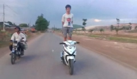 10. Đứng trên yên xe, điều khiển xe máy chạy vun vút