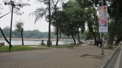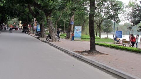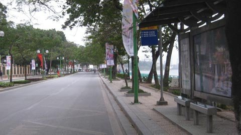 | Đường ven hồ Hoàn Kiếm cũng chỉ lác đác vài phương tiện qua lại. |