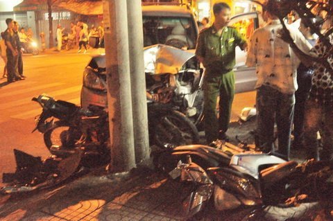 Theo quan sát, đầu xe du lịch ghim vào trụ điện bị vỡ nát. Cạnh đó, hai xe gắn máy trong tình trạng hư hỏng nặng nằm chỏng chơ trên mặt đường.