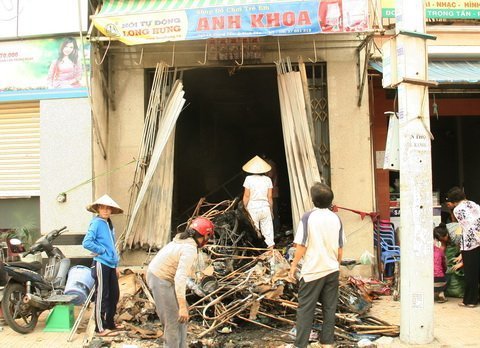 Lúc xảy ra cháy, cả khu phố đang chìm trong giấc ngủ. Rất may, ông chủ nhà bên cạnh là Phan Văn Minh (57 tuổi) thức dậy sớm phát hiện nhiều tiếng nổ lách tách từ shop Anh Khoa phát ra.