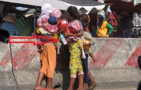 dưới 10 tuổi bồng bế 2 đứa trẻ đang còn bú sữa mẹ đứng giữa trời nắng chói
