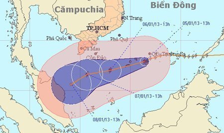 Đến chiều mai (6/1), vị trí tâm bão ở vào khoảng 7,0 độ Vĩ Bắc; 108,0 độ Kinh Đông, cách đảo Côn Đảo khoảng 230km về phía Đông Nam. Sức gió ở gần tâm bão giảm đi một cấp còn cấp 8, cấp 9, giật cấp 11, 12.