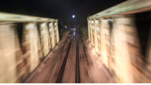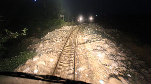 | Trong màn đêm dày đặc, những hiểm họa vẫn luôn rình rập đoàn tàu. Nhất là khi đi qua đoạn đường ray bị lũ cuốn đang được phục hồi. |