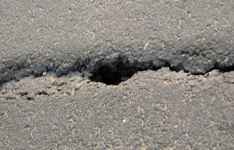 Theo quan sát của PV, cầu Đất Sét xuất hiện 4 vết nứt kéo dài ở 2 đầu cầu. Mỗi vết nứt có chiều dài khoảng 30m, thi thoảng có nhiều đoạn sụt lún và vết nứt toác rỗng từ 3-7cm.