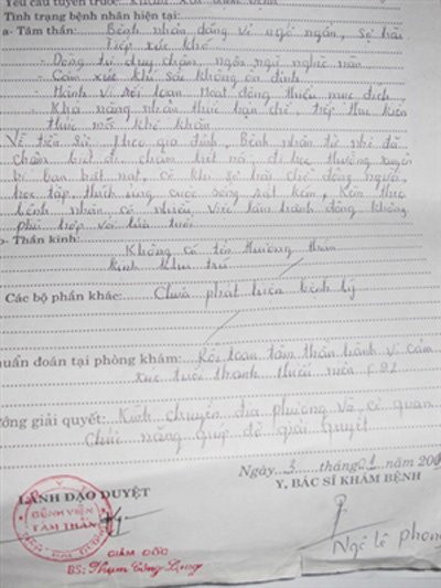 Khi chúng tôi nói hôm sau sẽ quay lại xin làm bệnh án và trả nốt tiền, giọng “cò” Thu chùng xuống: “Nó đã ghi nhận có thần kinh thì sợ gì. Cháu không phải lo cái ấy. Thế có chữ ký ông Lạng ở đấy không? Giám đốc người ta chứng nhận cho thì lo gì…”. “Cò” Thu khẳng định, chỉ cần thêm vài triệu là các bác sĩ ở đây có thể làm bệnh án cho cháu L.H.T.