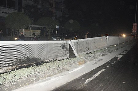 | Hàng rào dải phân cách bị đâm bẹp dúm. |