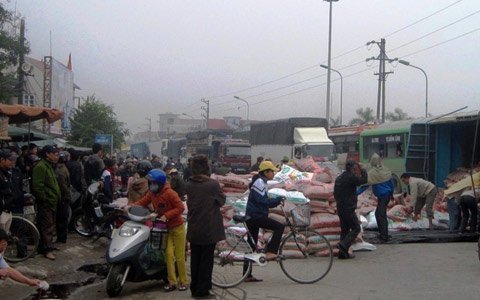 Do xe bị lật ngay ở giữa đường, nhiều bao cám cò trên xe đổ tràn ra đường khiến cho giao thông trên Quốc lộ 1A đoạn qua thị trấn Nghèn, huyện Can Lộc đã bị ùn tắc.