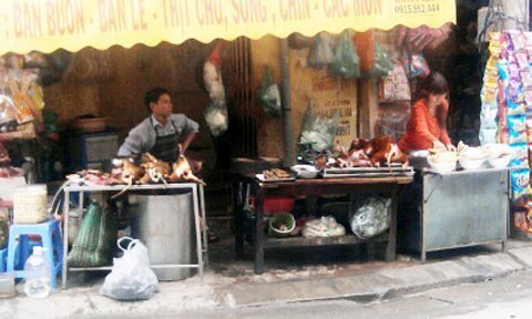 | Thức ăn nấu chín bày la liệt trên bàn, không phương tiện che chắn, ruồi muỗi bâu đầy nhưng vẫn hút khách. |