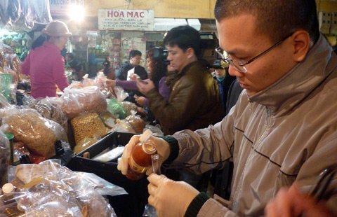 Quầy hàng đầu tiên mà đoàn thanh tra tiến hành kiểm tra là quầy hàng bán đồ khô. Sản phẩm tương ớt đóng chai (của công ty Nguyễn Nghiêm) được test nhanh ngay tại chỗ. Kết quả cho thấy không có hóa chất bảo quản bị cấm.