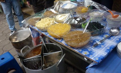 Dọc phố Trần Xuân Soạn có khá nhiều quầy bán chè nấu sẵn, tuy nhiên chủ cửa hàng “vô tư” để những nồi chè đang nghi ngút khói giữa vỉa hè đông đúc người qua lại mà không có dụng cụ che đậy. Phía bên trên những nỗi chè này là hàng loạt các âu chứa chè nguội được đậy qua loa bằng lớp túi bỏng mỏng dính.