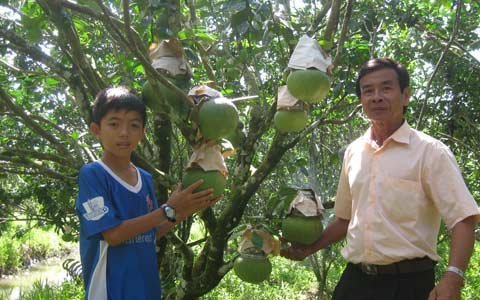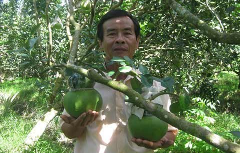 | Ông Võ Trung Thành và thành quả bên vườn bưởi |