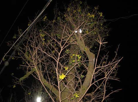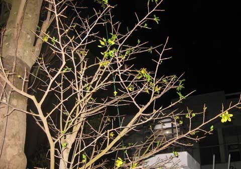 Phía trên hoa nở màu vàng óng, nhiều búp hoa bắt đầu chớm nở. Chủ nhân treo một bóng đèn trên cây để kích thích các nhú hoa khoe sắc.