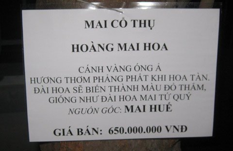 “Mai cổ thụ. Hoàng Mai Hoa. Cành vàng óng ả, hương thơm phảng phất khi hoa tàn. Đài hoa sẽ biến thánh màu đỏ thắm, giống như đài hoa mai tứ quý. Nguồn gốc mai Huế. Giá bán: 650.000.000 VNĐ”.