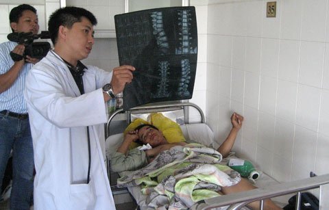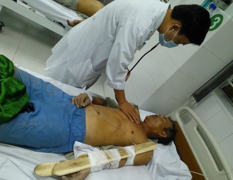 | Công nhân Mai Văn Dũng đang được bác sỹ chăm sóc. |
