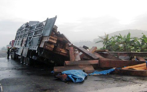 | Toàn bộ lốp sau bị nổ khiến chiếc xe bị nghiêng, gỗ tuồn ra đường. Ảnh: Duy Cảnh |