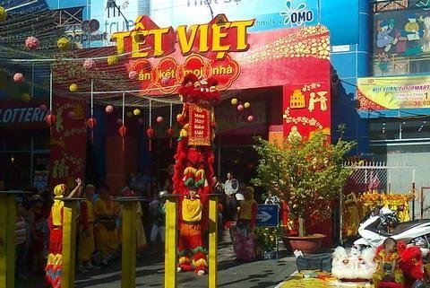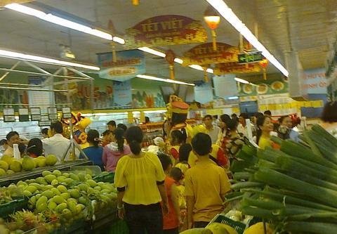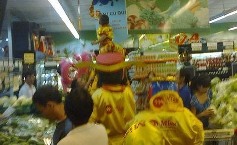 | Sau đó, ông thần tài dẫn đoàn tiến vào bên trong siêu thị |