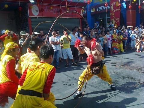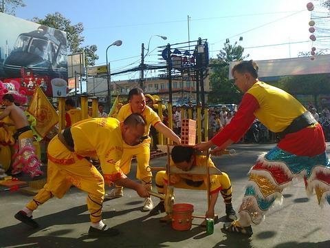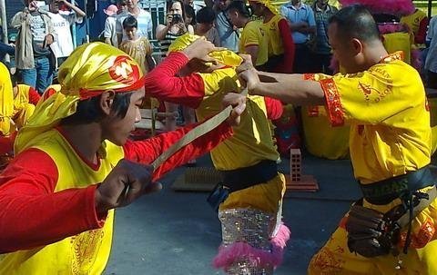 | Biểu diễn võ thuật, nội công : khoanh thép quấn vào cổ |