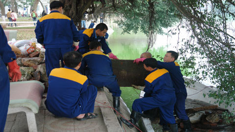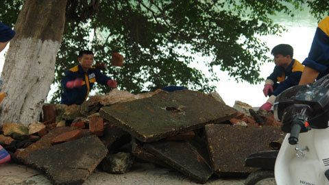 Những rác thải vật liệu xây dựng được vứt bỏ dưới chân Tháp Rùa từ nhiều năm nay đã được trục vớt lên. Đây chính là những phế thải vật liệu xây dựng của dự án xây dựng đường dạo ven chân tháp của ngành du lịch Hà Nội mấy năm trước.