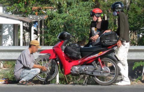 Khi đôi nam nữ đang dắt bộ xuống dốc cầu, một người đàn ông sửa xe đã nhanh chóng xuất hiện, khoát tay và kéo giúp chiếc xe bị nạn vào thay xăm.