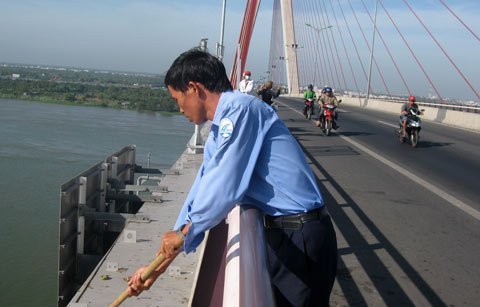 Trong khi đó, ở trên cầu, nhóm công nhân bảo vệ và vệ sinh Công ty TNHH một thành viên khai thác và quản lý cầu Cần Thơ vẫn tích cực quét dọn, thu gop rác và đinh trên mặt cầu mỗi ngày.
