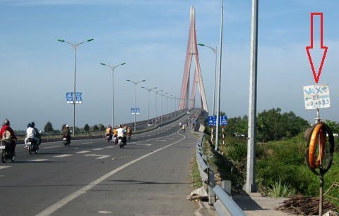 | Nhiều điểm vá xe ở 2 đầu cầu là nghi vấn của nạn rải đinh kiếm tiền bất chính (mũi tên đỏ) |