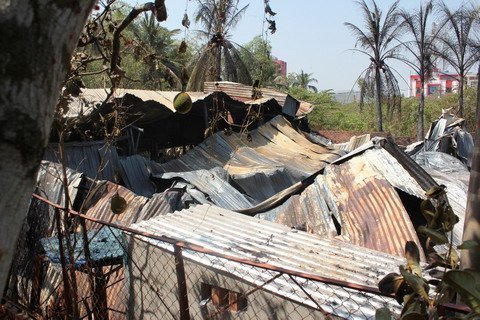Lửa tiếp tục hoành hành đe dọa các hộ dân sát vách. Một mảng vách sát nhà bà Nguyễn Thị Dung bị cháy đổ trong khi nhà bà đi vắng.