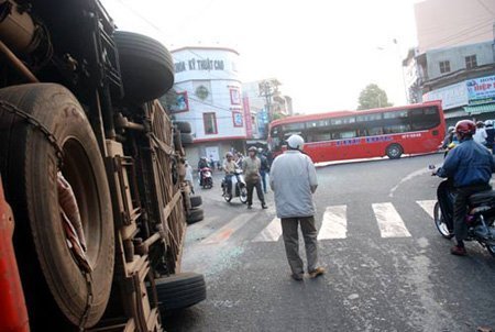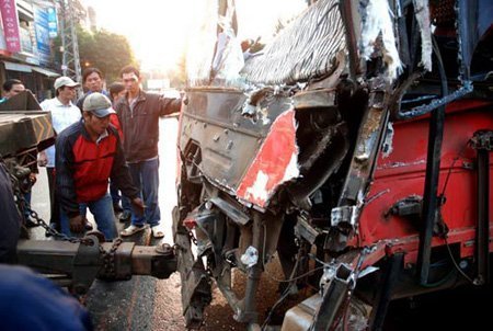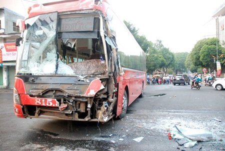 Cú tông khiến xe 47V - 2... lật nghiêng giữa làn đường, phần hông xe và đầu xe bị biến dạng. Phần đầu xe 47V... bị hư hỏng rất nặng. May mắn, vụ tai nạn xảy ra vào thời điểm vắng người, trên cả hai xe không còn khách. Hai tài xế lái hai chiếc xe bị thương nhẹ.
