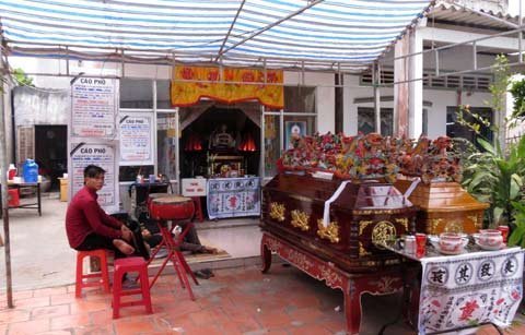 3 chiếc quan tài của ba mẹ con nghi ngút khói hương. Chiếc bàn thờ được lập vội mà không có di ảnh.