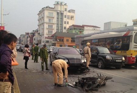 | Siêu xe Bentley Continental Flying Spur thì gặp phải sự cố vào khoảng 16h ngày 27/1 trên đường Nghi Tàm khi chiếc siêu sang đang chạy về hướng đường Lạc Long Quân, Hà Nội. Rất may không có người thiệt mạng trong vụ tai nạn. |
