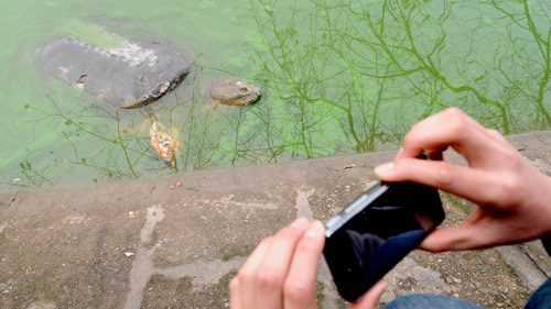 Gần 11h trưa, cụ rùa quay lại khu vực đường Đinh Tiên Hoàng, tiến sát gần bờ như định bò lên khu vực kè quanh hồ thì có một thanh niên thò tay chạm vào đầu cụ rùa.