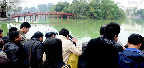 - Sáng nay, 19/3, trời Hà Nội nắng ấm, dễ chịu sau mấy ngày mưa rét. Có lẽ, do thời tiết đẹp nên cụ rùa Hồ Gươm nổi từ rất sớm, thu hút hàng nghìn người dân hiếu kỳ đến xem.