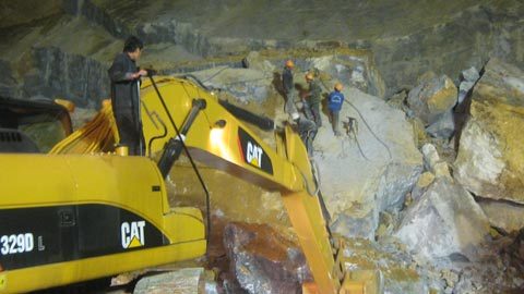 | Nhóm thợ khoan đá đang tích cực phá đá tra mìn. Ảnh: Quốc Huy |