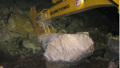 | Những tảng đá khổng lồ đang được các máy đào kéo ra khỏi hiện trường. Ảnh: Quốc Huy |