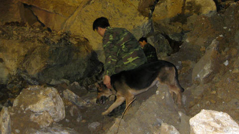 Lúc 22giờ 20 phút, Bộ tư lệnh Bộ đội Biên phòng điều 3 chú chó nghiệp vụ cấp tốc từ Hà Nội vào Nghệ An có mặt tại hiện trường. Rất nhanh, những chú chó màu vàng đen lao vào “tác nghiệp” giữa đống đất đá lởm chởm.