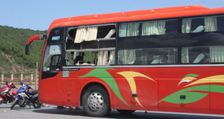 2 tấm cửa kính lớn bên trái phần đầu xe nát vụn. Nguyên nhân ban đầu được cho là một chiếc loa gói kín trong hộp cát tông (do hành khách gửi từ bến xe Vinh 3 ngày trước) phát nổ. Lái xe chính, phụ xe cùng lơ xe bị thương rất nặng sau vụ nổ.