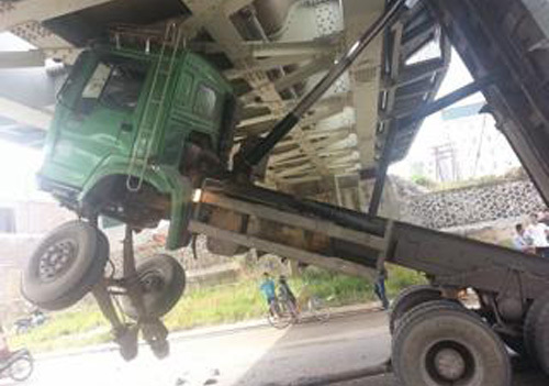 Quên hạ thùng, xe tải treo ngược trên cầu