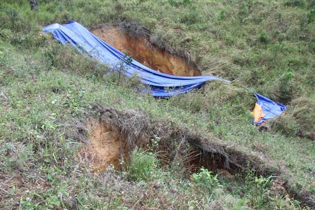 Theo ghi nhận của PV, tại vị trí lún nứt xuất hiện 2 hố sụt lún. Trong đó hố sụt lún lớn có đường kính 10m, độ sâu khoảng 4-5 m. Cách đó vài mét là một hố sụt lún nhỏ hơn, đường kính 2-3 m, độ sâu 2m.