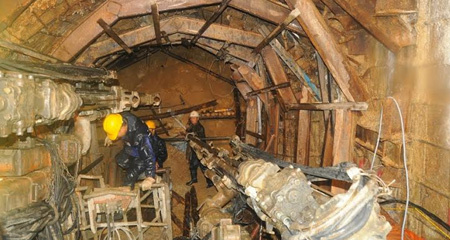 Hàng nghìn mét khối đất đá theo 2 hố sụt lún này đã đổ ụp xuống, lấp đường hầm khiến 12 công nhân mắc kẹt.
