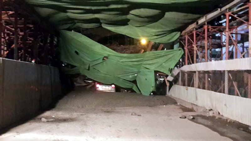 Một nhân chứng nói với PV, vụ sập giàn giáo khiến một xe taxi mắc kẹt bên trong. Rất may tài xế và 3 hành khách đã được giải thoát ra ngoài.