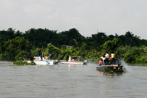 Công tác tìm kiếm gặp nhiều khó khăn do mặt sông có nhiều lục bình phủ