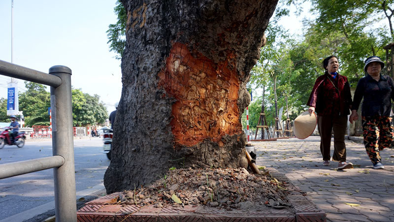 Đồng thời, một số độc giả khẳng định, ở tuyến phố Lê Duẩn, họ nhìn thấy một cặp nam nữ, đi xe máy và dùng dao lột vỏ cây rồi cho vào bao tải chở đi và không chỉ ở Lê Duẩn, các phố như Kim Mã, Phạm Văn Đồng...cũng có nhiều cây "bị thương".