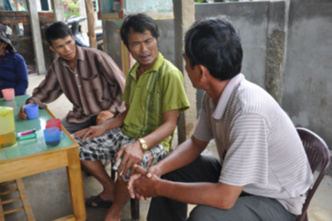 | Ngư dân Tiêu Viết Là (ngồi giữa) kể chuyện bị Trung Quốc bắt giữ. |