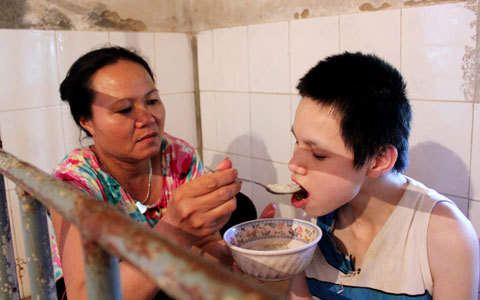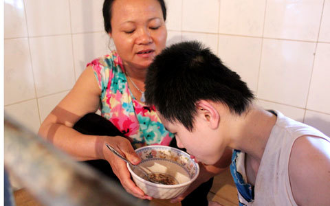 12 năm đầu là quãng thời gian vất vả nhất của gia đình chị. Nhìn đứa con tội nghiệp chẳng thể hoạt động bình thường như những đứa trẻ khác, chị Lan đã phải gắng sức chăm cho con để nó có thể bò hoặc ngồi như những đứa trẻ khác. Hàng ngày, ngoài việc cho con ăn chị còn phải bóp chân, tay cho con để không bị cứng lại.