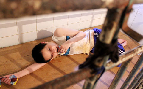 Sau hơn chục năm được mẹ chăm sóc, bé Anh đã có thể bò được. Nhìn đứa con hiếu động quá nhưng không thể chạy nhảy như những đứa trẻ khác, sợ nguy hiểm cho con, anh chị đành gạt nước mắt đành bỏ con vào trong cũi sắt vì chẳng thể ở bên cạnh con cả ngày.