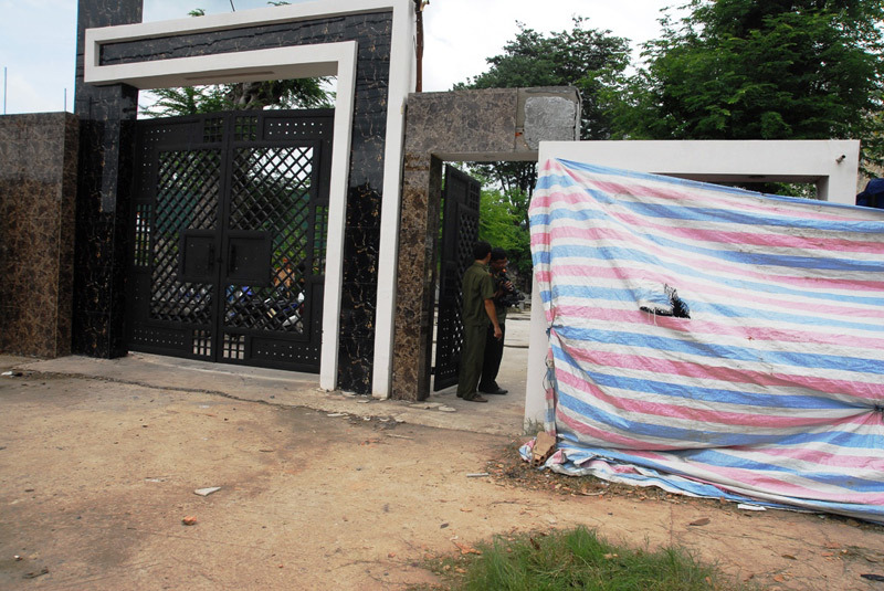 Mặt tiền căn biệt thự được người nhà các nạn nhân giăng bạt để làm khuất tầm nhìn của người dân hiếu kỳ
