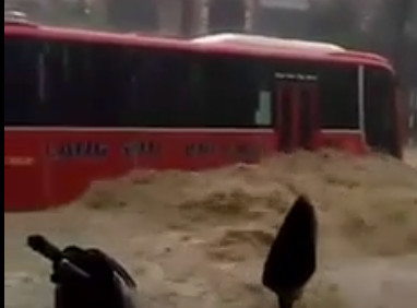 Người xem không khỏi rụng rời khi chứng kiến chiếc xe khách chết máy, bất lực, nằm "chịu trận" giữa dòng nước lũ hung dữ, đục ngầu.