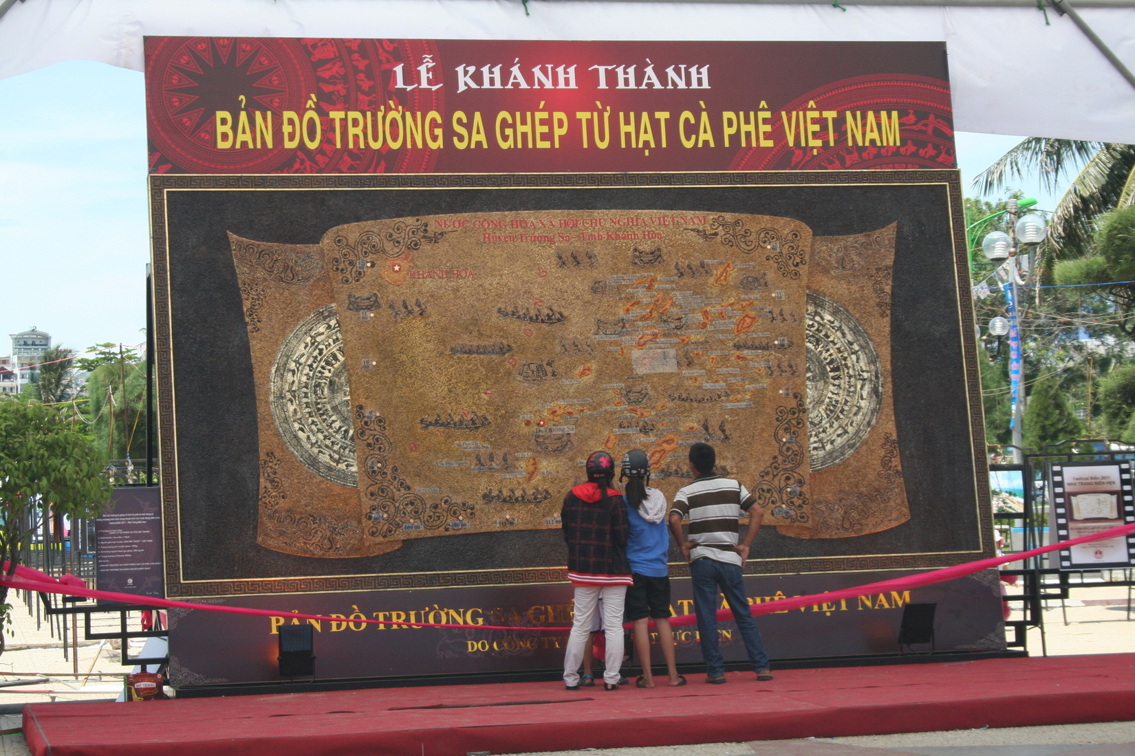 Mô hình bản đồ Trường Sa ghép bằng hạt cà phê Việt Nam cũng đang được trưng bày bên cạnh triển lãm nghệ thuật cát. |