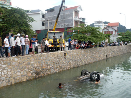 Khoảng 14 giờ ngày 14.6, tại tổ 4, khu 8, phường Hồng Hải, TP Hạ Long, Quảng Ninh, một chiếc ô tô Santafe đã lao xuống cống thoát nước bên đường sau khi tránh gấp một chiếc xe máy đi ngược chiều.