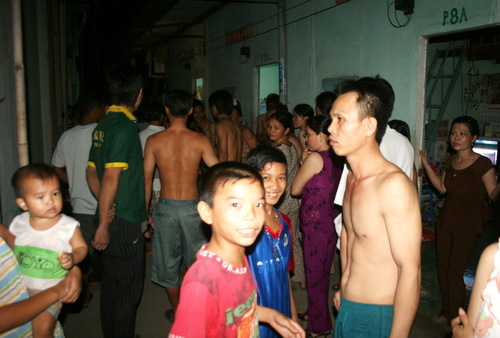 Bà con vẫn chưa vào phòng, còn đứng chật cứng cả con hẻm hẹp. Trong không khí, chúng tôi cảm nhận mùi hôi còn thoang thoảng đâu đây kèm theo một cảm giác cay cay nơi mắt.